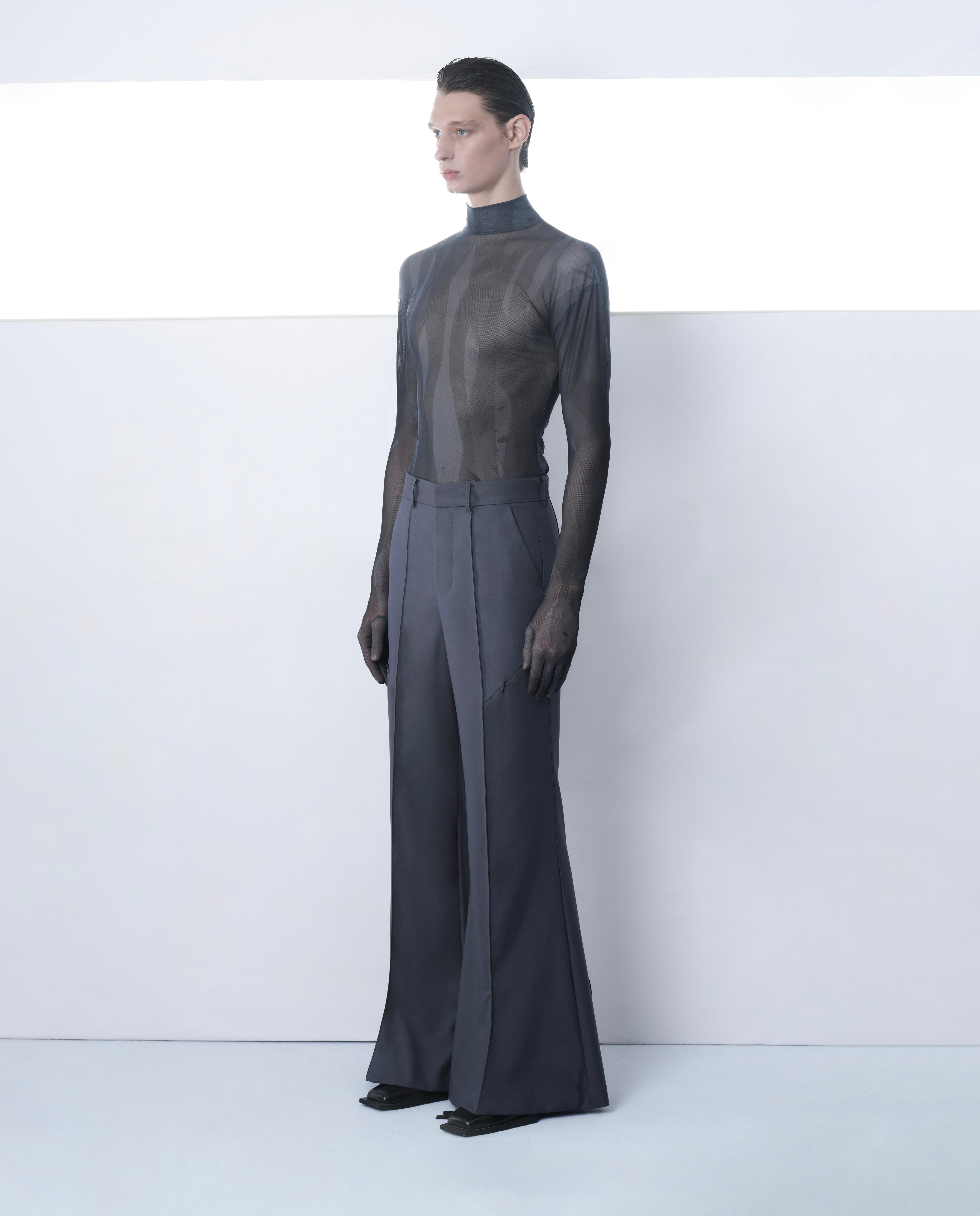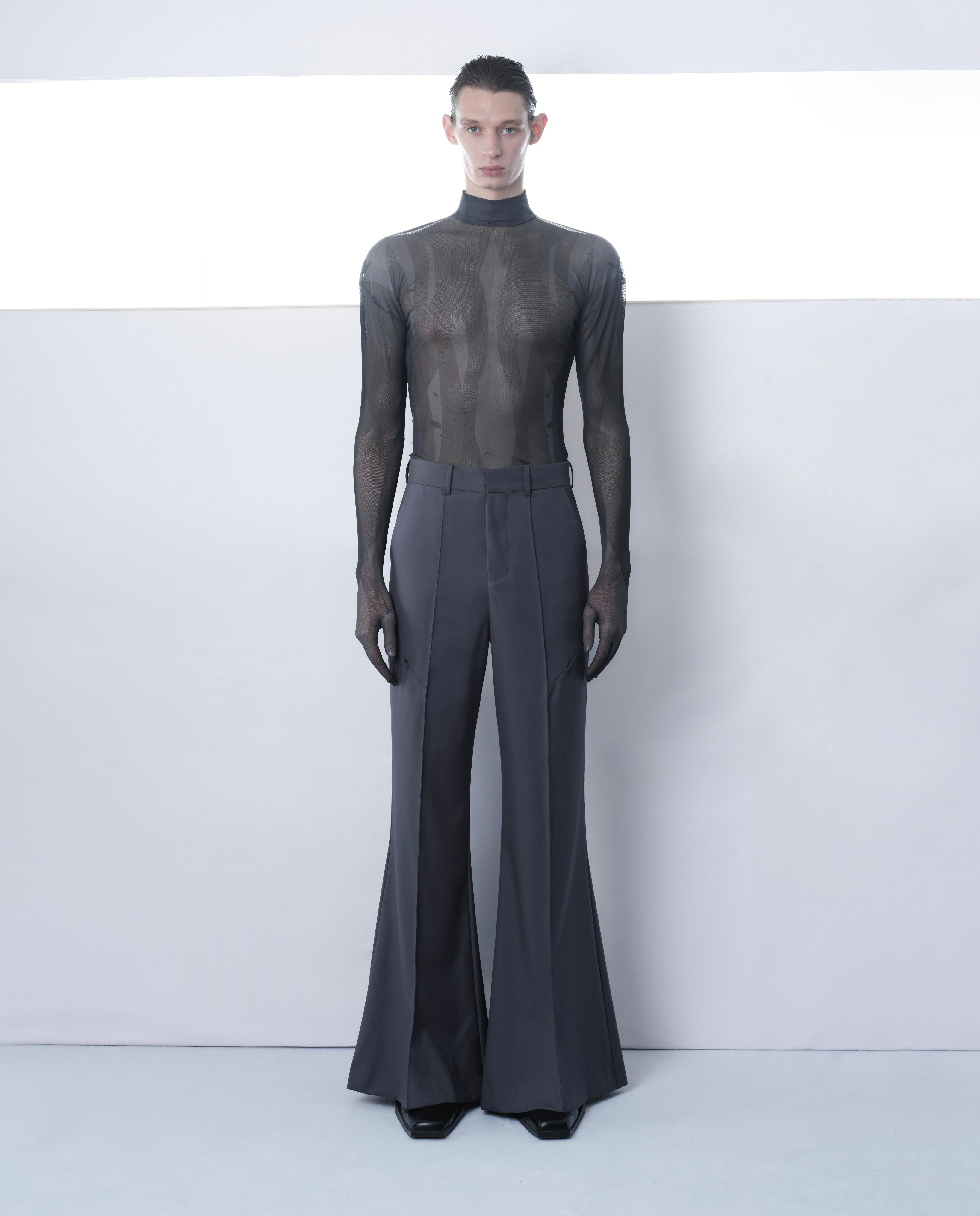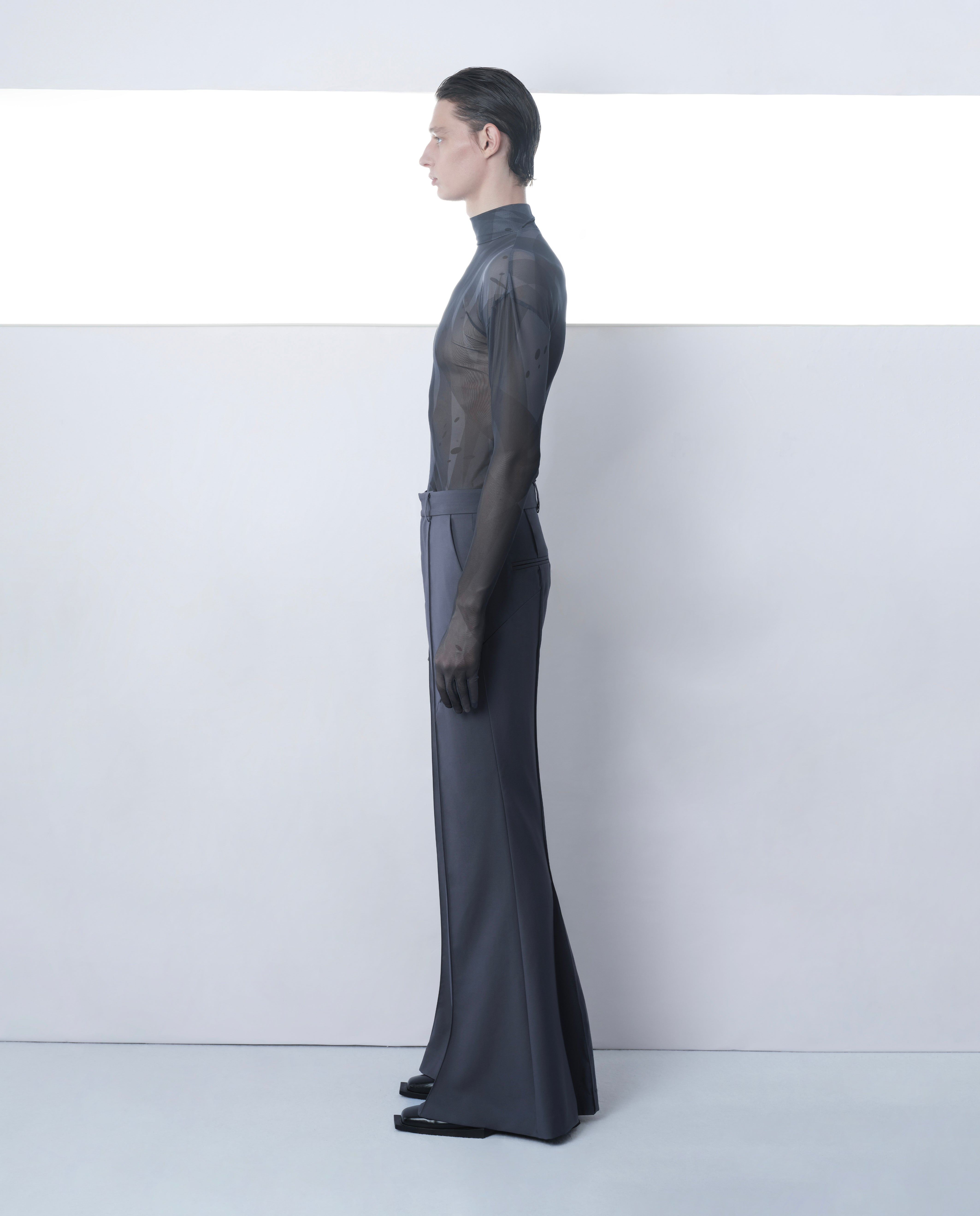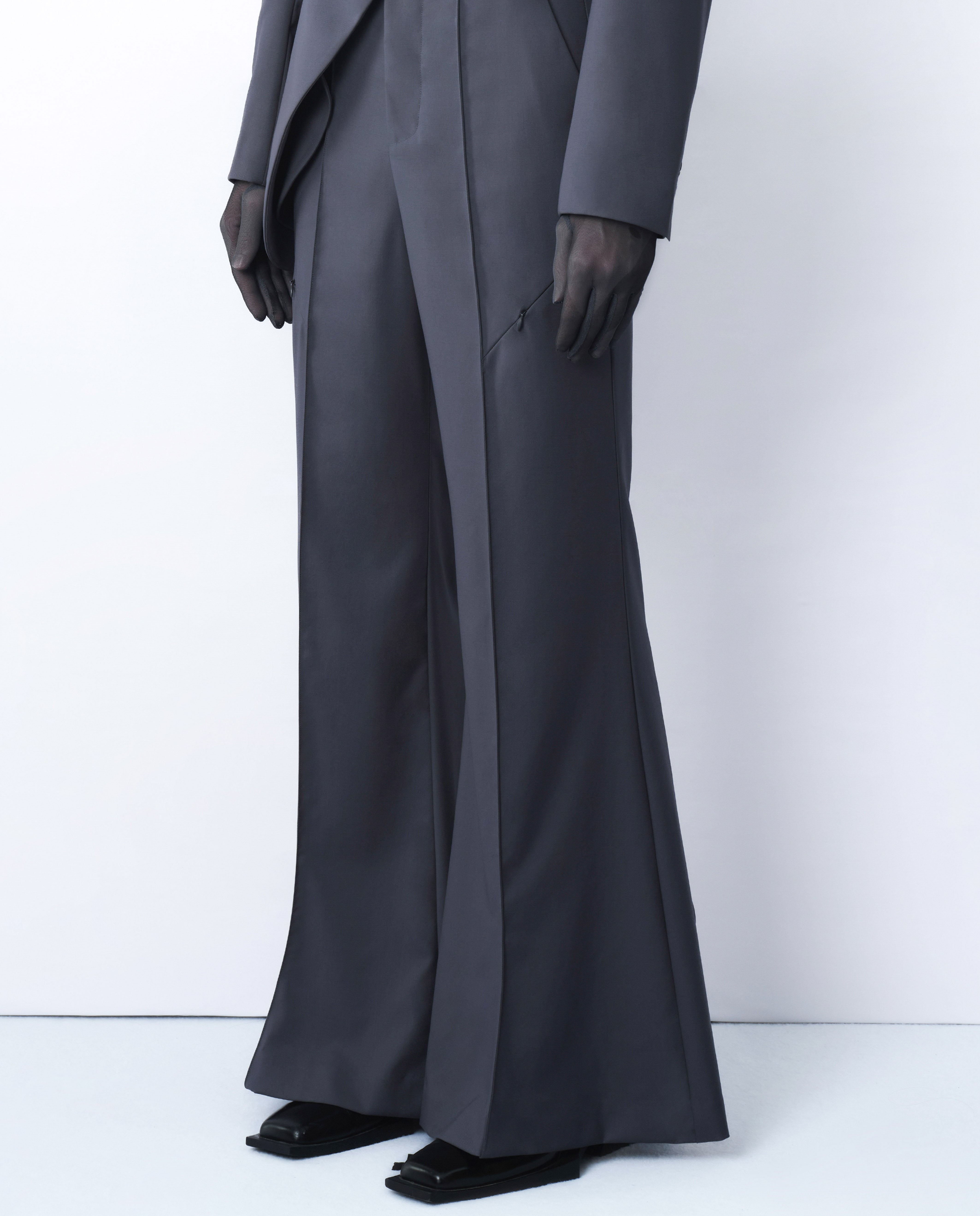 Slim fit flared trousers. Double side pockets. Horse leg cut at the back